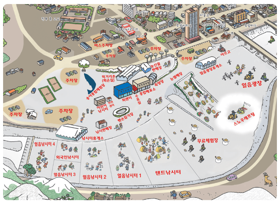 강원도 평창 송어축제 행사를 한눈에 확인할 수 있는 행사장 지도예요. 주차장을 비롯해 축제 프로그램, 및 먹거리, 매표소 등 위치를 확인하고 가면 헤매는 일 없이 편안하게 즐길 수 있을 것 같습니다.