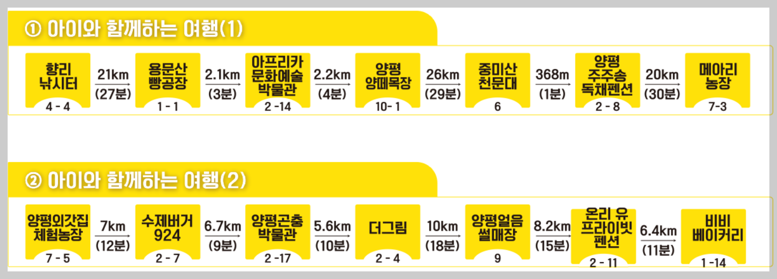 '경기엔 양평' 공식홈페이지에는 아이와 함께하는 여행, 몸이 불편하신 분들이 가실 수 있는 휠체어 진입코스, 어르신힐링코스, 반려견동반코스, 연인추천코스, 당일여행코스, 1박 2일 코스, 2박 3일 코스 등으로 정리되어 있어 경기도 양평 가볼 만한 곳 또는 프로그램이나 체험 등을 알아보시는 분들에게는 너무나 편리하게 여행을 즐길 수 있습니다.