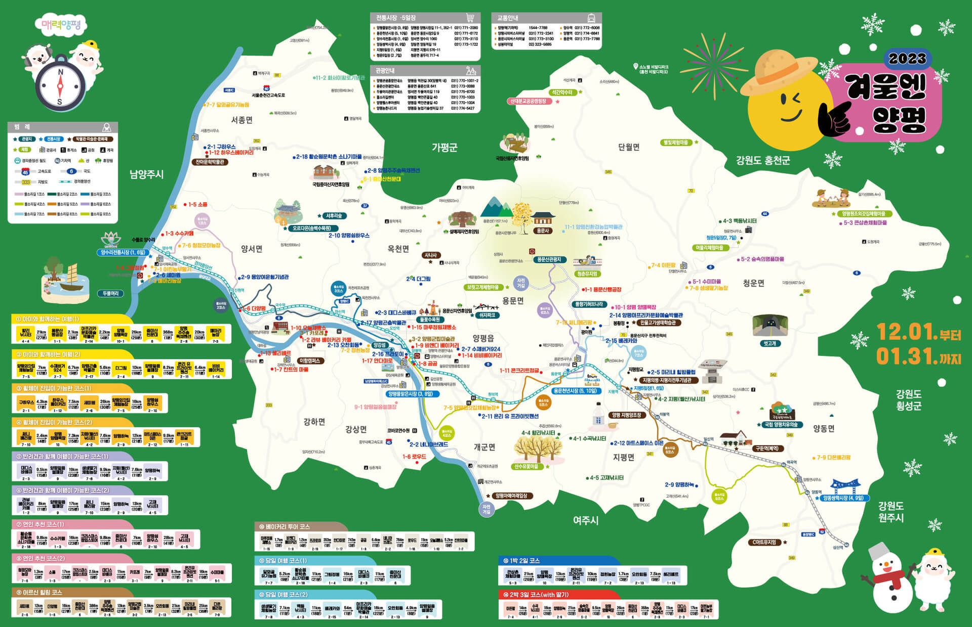 양평 전역에 펼쳐지는 대축제라서 막상 체험이나 행사를 참여하려고 해도 위치를 몰라서 헤맬 때가 있으시죠? '겨울엔 양평'은 한눈에 볼 수 있는 지도가 있어 관광하는 내내 편안하게 즐길 수 있답니다.