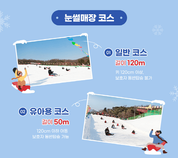 ● 일반 코스 : 눈썰매장 길이가 120m로 키가 120cm 이상인 경우에만 탑승이 가능하며, 120cm 이하는 보호자 동반 탑승이 불가합니다.