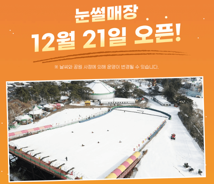 눈썰매장은 스노우 펀랜드 내에 위치해 있습니다. 눈썰매는 제공이 되며, 개별적으로 가지고 온 눈썰매는 사용하실 수가 없어요. 또한 날씨와 공원 사정에 따라 조기 종영 또는 휴무일이 발생할 수 있으니 방문 전에 꼭 문의하고 가시는 게 좋습니다.
