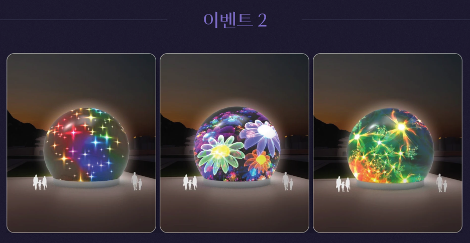 [ 이벤트 2 - 새해 미디어 쇼 ] 2023 서울빛초롱축제의 대표 빛조형물인 '시공의 달(White Hole)에서 다채로운 스크린쇼와 카운트다운을 만나볼수 있습니다. - 운영시간1. : 23.12.31( 23:55 ~ 00:10) - 운영시간2. : 24.1.1 ~1.(21:50 ~ 22:00) |