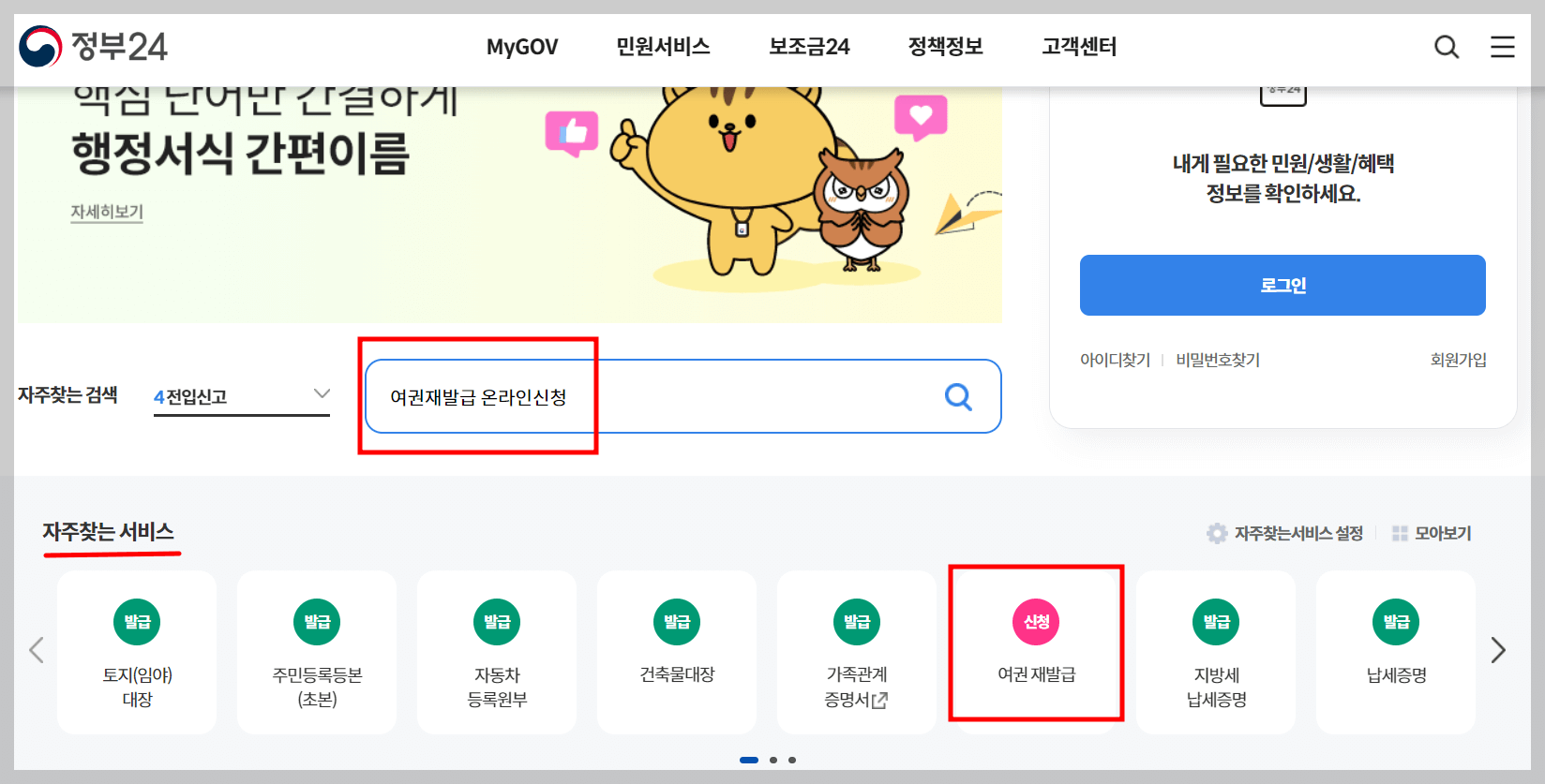 2. 검색창에 "여권 재발급신청"입력 또는 자주 찾는 서비스 "여권 재발급" 클릭