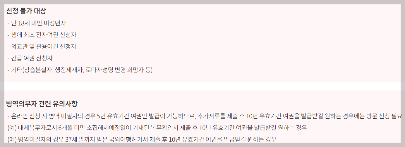 18세 미만 미성년자, 생애최초 전자여권 신청자, 외교관 및 관용여권 신청자, 긴급 여권 신청자 등이며, 병역의무자는 아래 유의사항을 꼭 확인해 주세요!