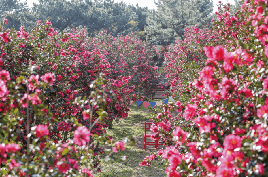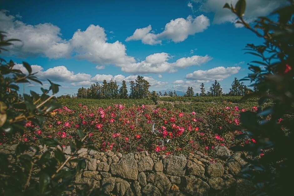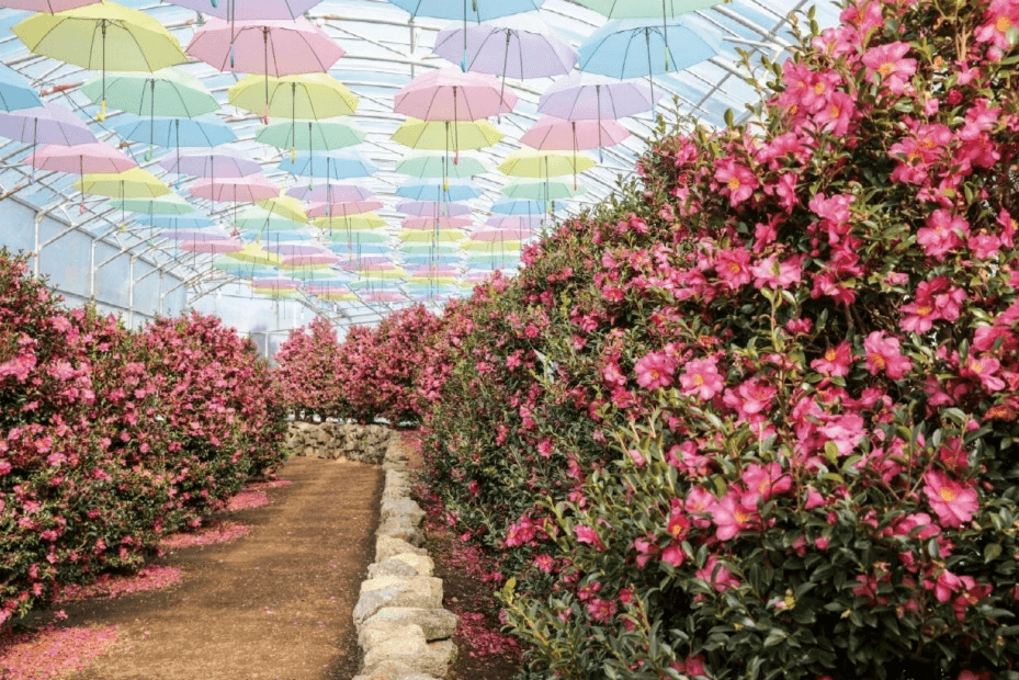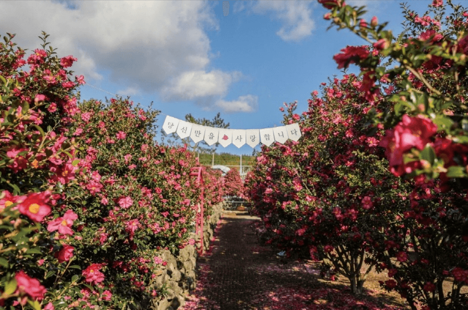 제주도 동백꽃 명소하면 휴애리를 떠올릴 수 있습니다. 한라산을 배경으로 수많은 꽃들이 아름답게 펼쳐진 꽃 정원인데요. 언제나 찾아갈 수 있게 연중무휴로, 다양한 꽃 축제가 열리는 곳입니다.