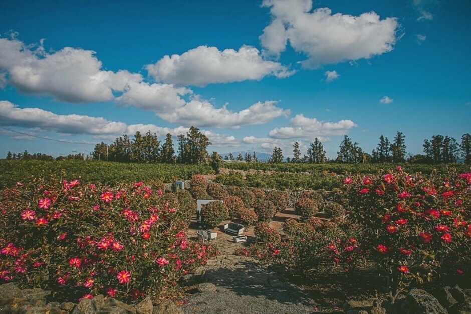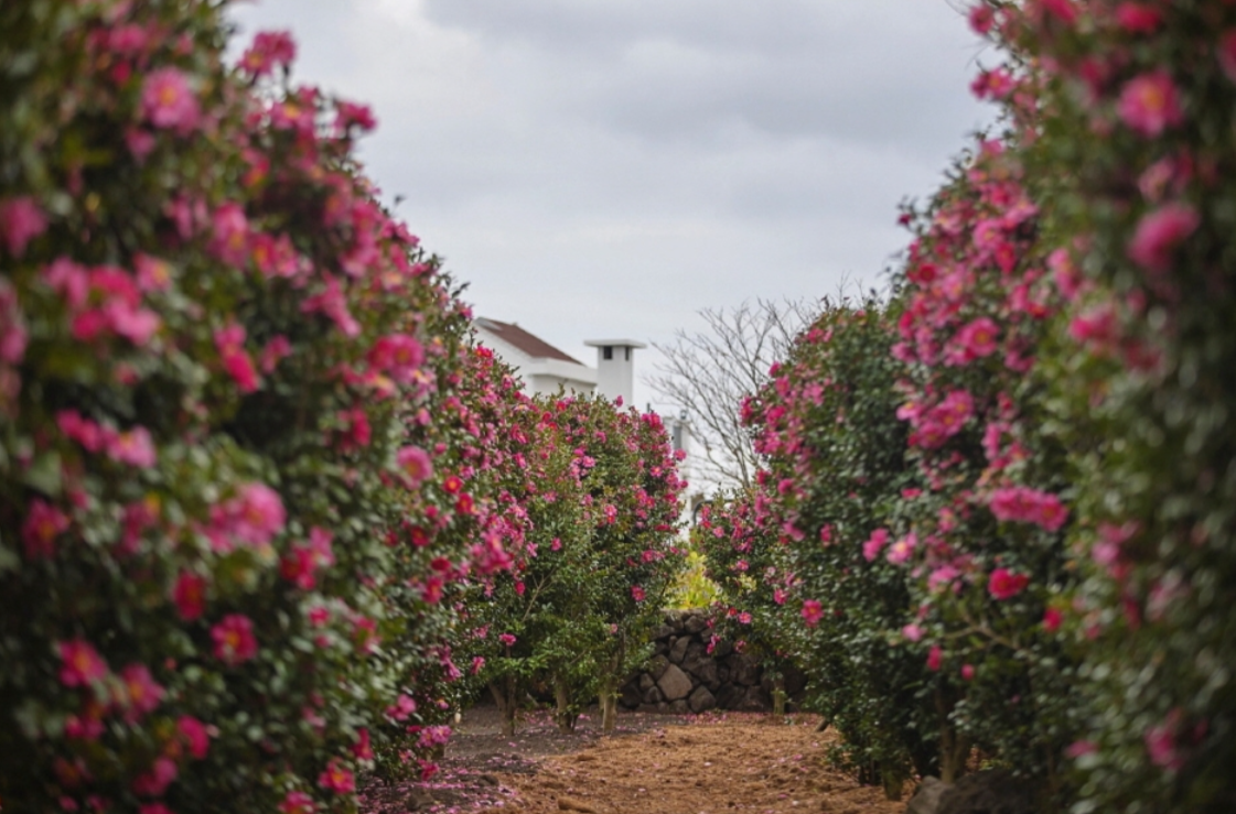 4천여 평의 다양한 동백꽃 산책로가 마련되어 있고, 웅장한 산방산과 송악산 사이로 형제섬 및 탁 트인 바다를 볼 수 있는 환상적인 조망입니다.