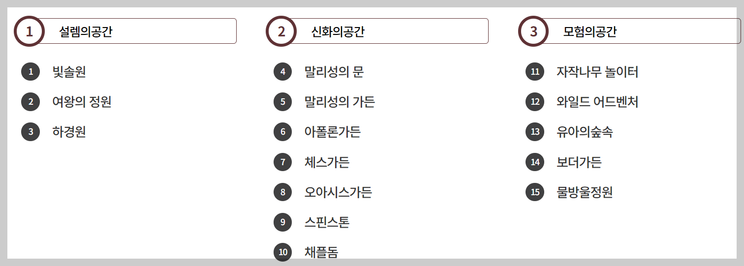 두 번째로 들어서는 신화의 공간은 베르사유 스타일의 프랑스 정원부터 이탈리아의 워터가든까지 유럽의 영웅과 신들을 만나 볼 수 있어요. 특히나 유럽의 영웅들과 신화 이야기를 자연과 함께 풀어낸 서양의 아름다움을 제대로 경험해 보실 수 있습니다.