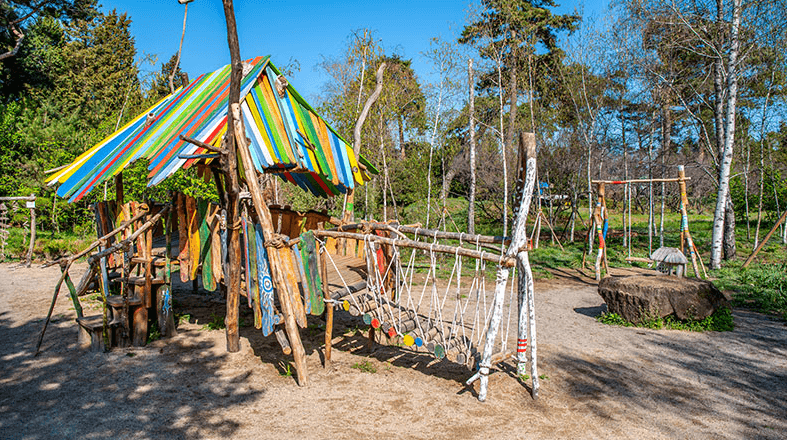 모험의 공간은 특히나 아이들이 좋아하는 공간이 아닌가 싶습니다. 자작나무와 소나무 그늘아래 모래놀이, 숲 속 모험, 나무 쉽터 등 100% 친환경 숲속 놀이터로 구성되어 있어 어린아이들이 신나고 즐겁게 자연학습을 익히게 해 줍니다. 또한 아이뿐만 아니라 어른들도 쉼을 느끼며 동심에 세계에 빠져들 수 있어요.